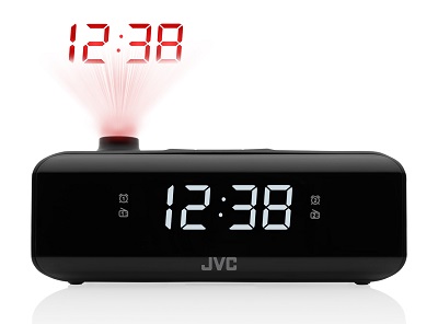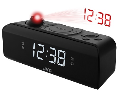The JVC RA-E211B clock radio will grab your attention with its elegant design and large LED display. The digits displaying the time are 22 mm high. The Dimmer function adjusts the display brightness. Another practical feature is the ability to project the time on the wall with 180° rotation.