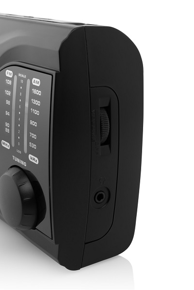 The radio can be powered from a power outlet or by battery.