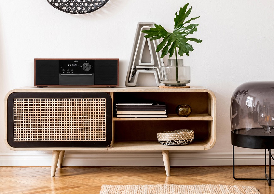 This is how to characterise the elegant tabletop player JVC RD-E761 allowing several ways to listen to your favourite music or spoken word. The appliance is made of wood combined with black accessories. It excellently fits into any indoor premises.