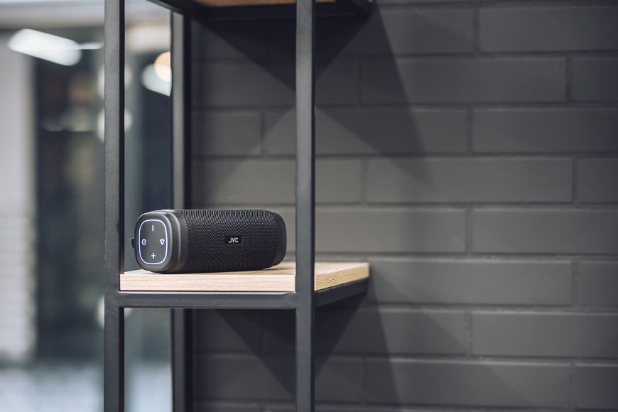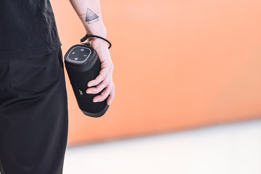 Thanks to IPX6 splashing water resistance, JVC XS-E322B wireless speaker may be used without any problem in your bathroom, near swimming pool or in the rain. A leather strap is also included in the package to carry the speaker conveniently.
